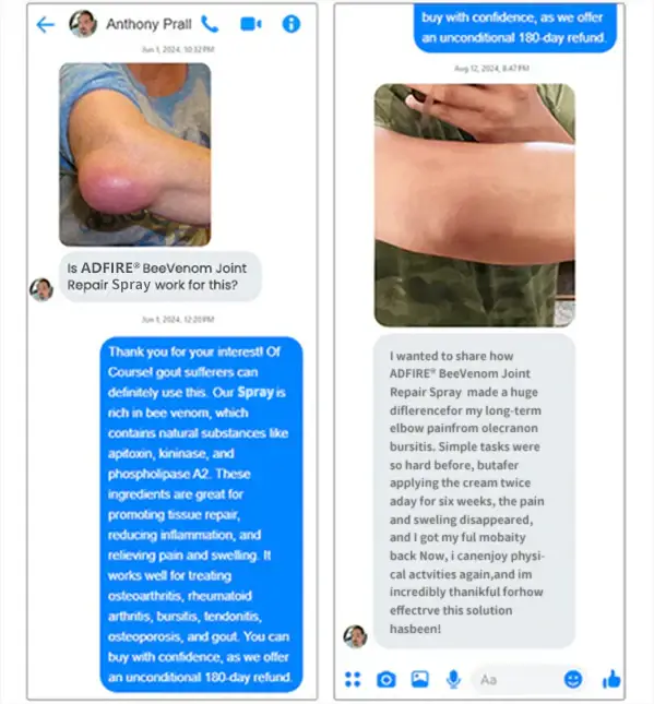“For over five years, agonizing gout pain in my feet made life miserable. I spent thousands on treatments that didn’t work. Desperate for a solution, I tried Adfire™ Bee Venom Bone & Joint Revive Spray. Within three weeks, I noticed relief, and after seven weeks, my pain was completely gone! This spray restored my freedom and quality of life.”