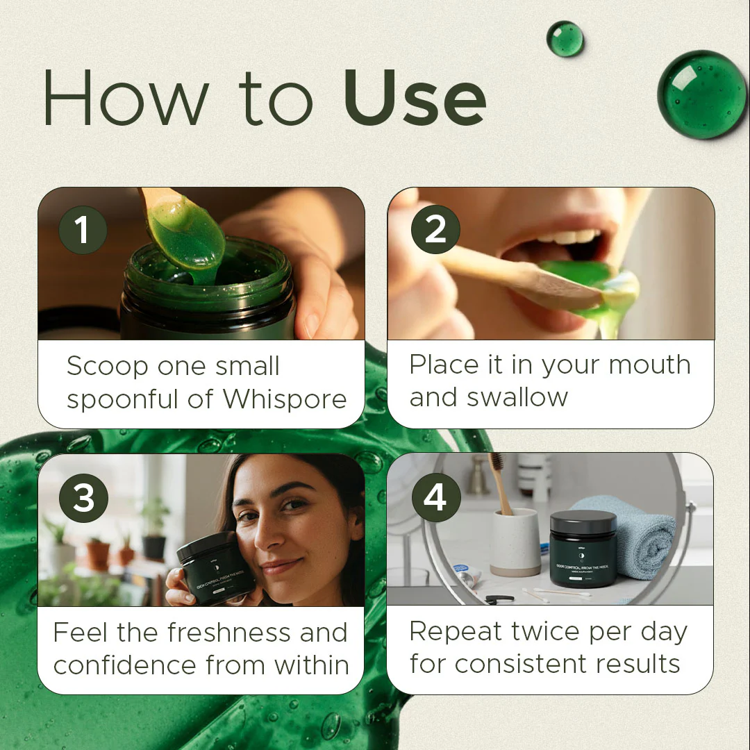 Whispore is a natural, edible deodorant supplement designed to combat body odor and bad breath from the inside out. It comes in a gel form, with two scoops taken daily, and is formulated with a blend of parsley, green tea, lemon balm, clove bud oil, peppermint essential oil, and sodium copper chlorophyllin.