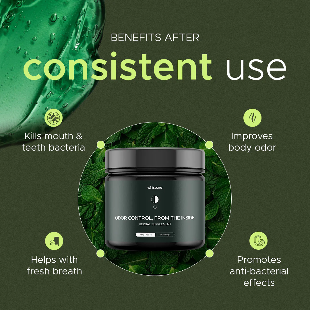 Whispore works by addressing the root causes of body odor: bacteria and toxins. The ingredients in Whispore possess natural antibacterial properties that help neutralize odor-causing bacteria in the body. Sodium copper chlorophyllin, derived from chlorophyll, binds with volatile organic compounds (VOCs) produced by bacteria, effectively neutralizing odors.