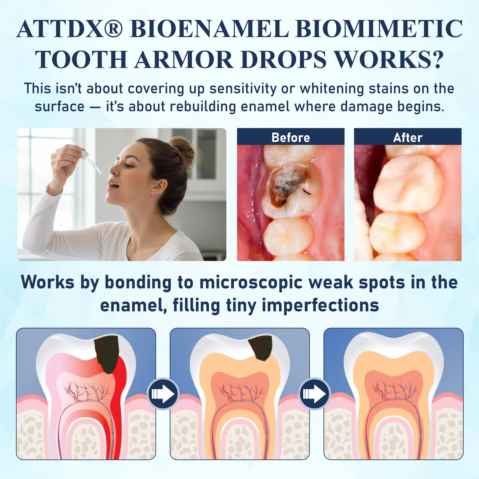 This is not about temporarily masking sensitivity or polishing away surface stains. ATTDX® BioEnamel Biomimetic Tooth Armor Drops are designed to support enamel repair at the microscopic level where early damage begins.