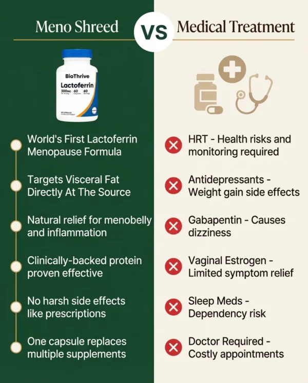 Unlike many ordinary menopause supplements that rely on generic botanicals and hope for the best, MENO SHREED is built around Lactoferrin — a bioidentical iron-binding protein your body already recognises — combined with a precision blend of gut-support and metabolism nutrients designed to work from the inside out.