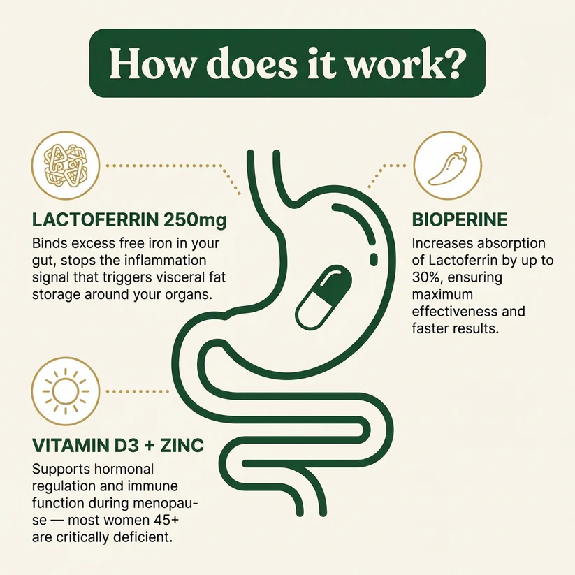 Where most standard formulas fall short, they address only the symptoms while the real underlying cycle continues unchecked. When estrogen declines, iron metabolism shifts, inflammation increases, and the gut barrier quietly degrades — creating a cycle that drives the body to hold onto visceral fat. Masking the symptoms without addressing this cycle is why so many women feel let down by what they’ve tried before.