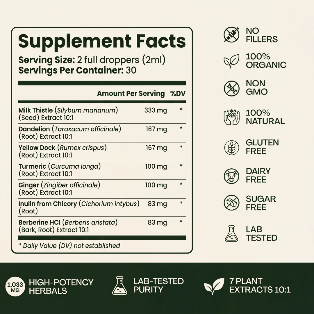 Supports the body’s natural multi-stage internal cleansing process Helps reduce bloating and restore digestive comfort over time Promotes more consistent energy and reduced daily fatigue Supports liver function during and after the cleansing process Convenient liquid drops — easy to add to water, juice, or a morning smoothie