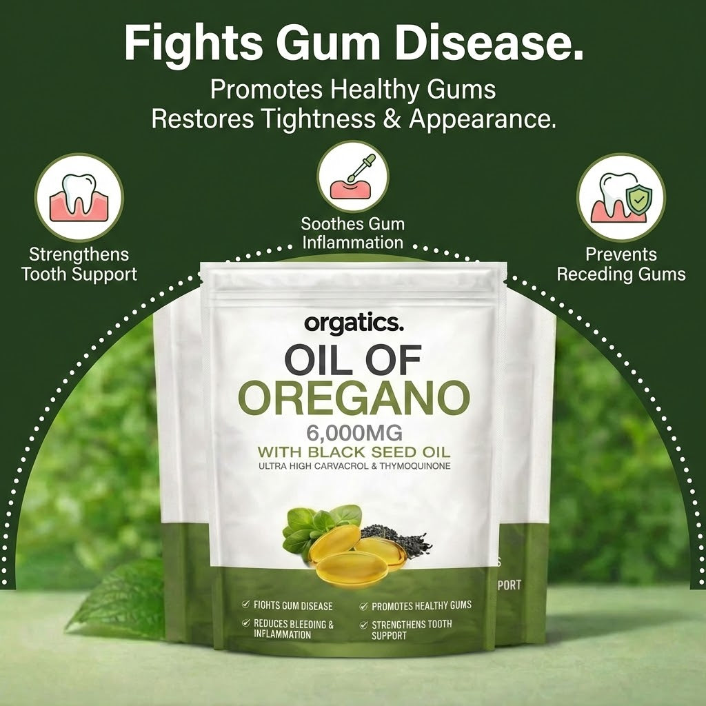 Orgatics Oregano & Black Seed Oil oral health supplement designed to support gum health, help reduce harmful bacteria, and promote healthier gums with botanical oils