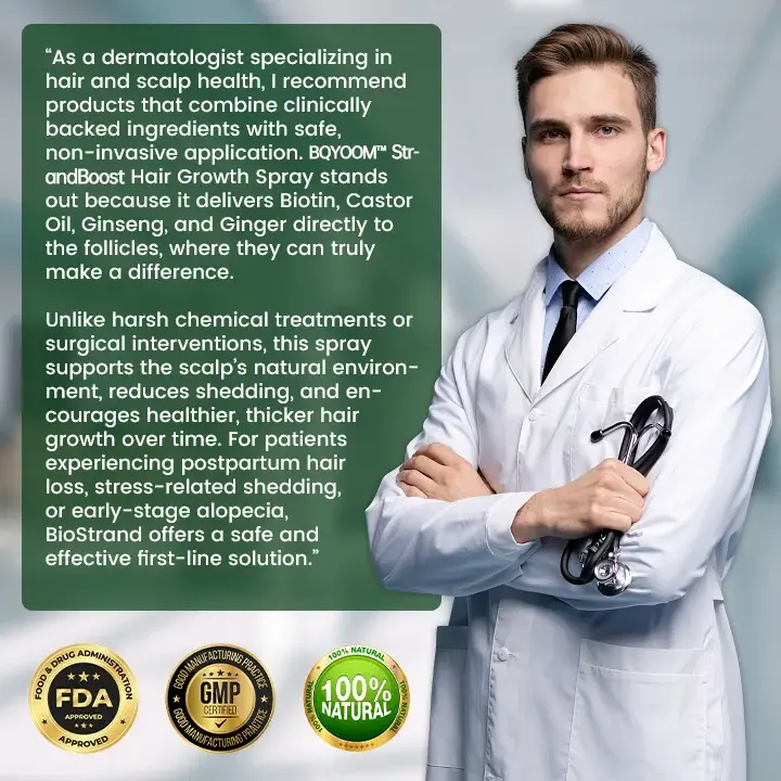 Clinically supported and dermatologist-tested, BQYOOM™ StrandBoost Hair Growth Spray nourishes the scalp and strengthens follicles, creating the ideal environment for regrowth. By enlarging follicle size and delivering oxygen-rich nutrients, it supports thicker, denser, and healthier hair. This natural formula helps combat issues like genetic hair loss, DHT-related thinning, and postpartum shedding—leaving your strands visibly stronger and revitalized with daily use.