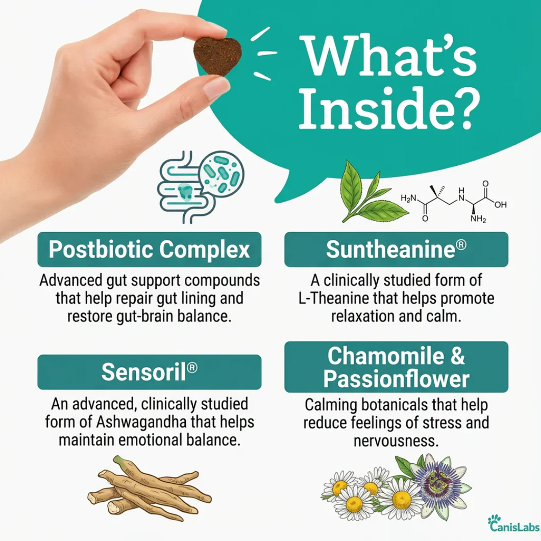 Do these chews contain sedatives or heavy calming agents? This formula is designed to avoid that overly sedated feel, focusing instead on gut-brain balance and emotional wellness.