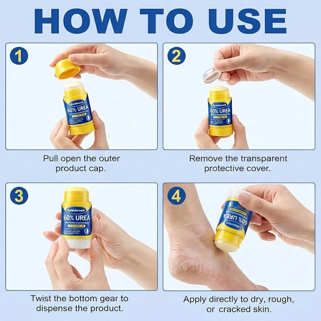 Celestvéra Foot Moisturizing Stick uses 60% Urea to soften cracked heels and calluses. This dry-touch stick helps reduce rough skin for smoother feet