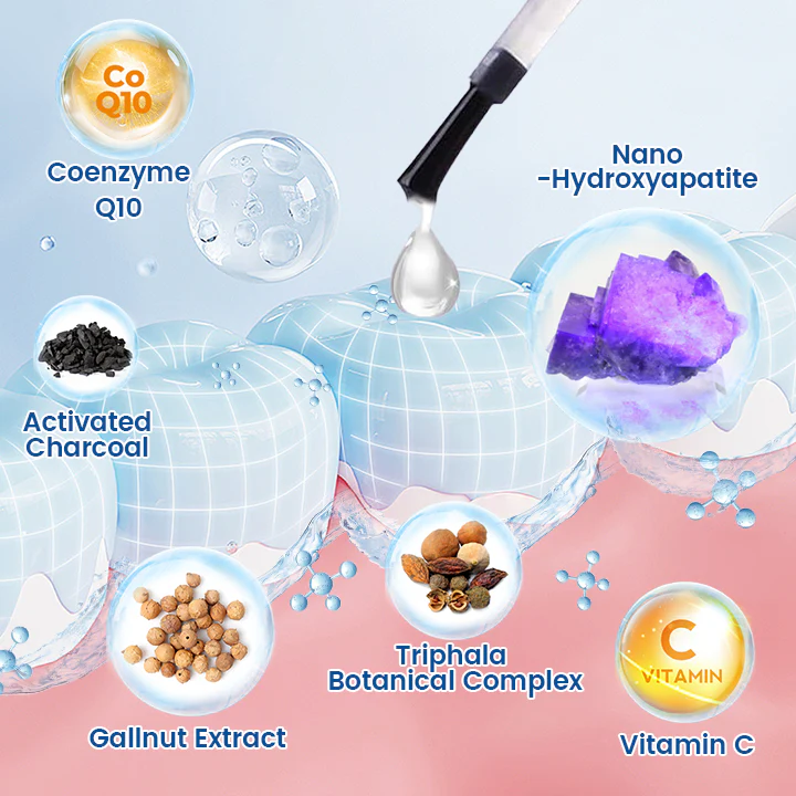 Triphala Botanical Complex: A traditional herbal blend known for its antioxidant, soothing, and antimicrobial benefits. Helps balance the oral microbiome and supports healthier gums. - Gallnut Extract (Rich in Tannins): Offers natural antimicrobial and astringent properties; helps reduce sensitivity by supporting dentin tubule sealing and maintaining a cleaner oral environment.