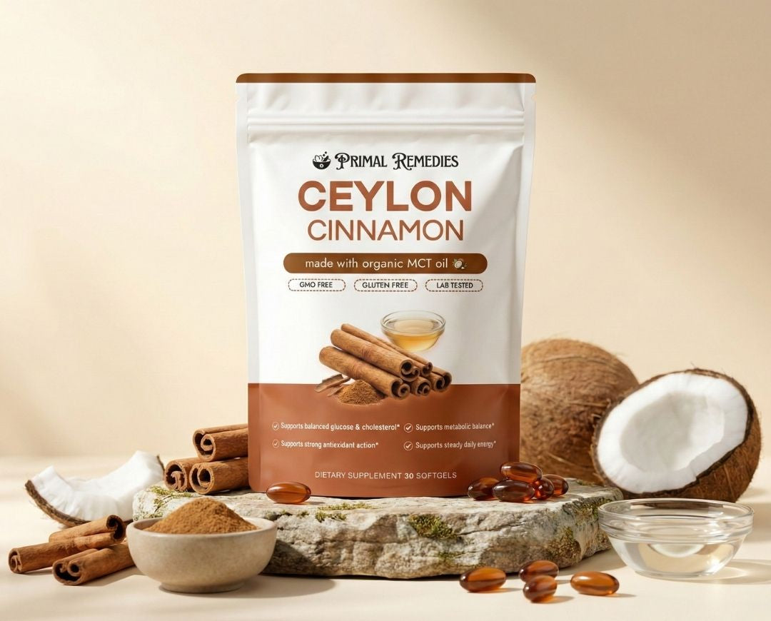 Primal Remedies Ceylon Cinnamon uses pure Ceylon cinnamon extract from Sri Lanka, combined with organic MCT oil for superior absorption and faster action. This synergy supports your body’s natural ability to balance blood sugar, maintain healthy cholesterol, and restore steady daily energy.