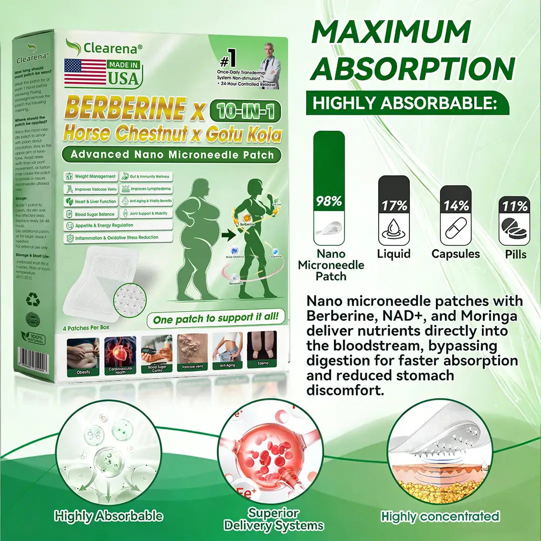 Clearena Moringa Berberine NAD+ microneedle patch supports weight management, appetite control and skin firmness with gentle transdermal delivery