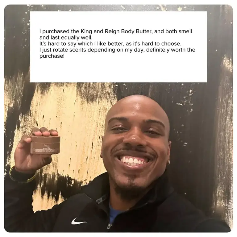 Crowned King Cologned Body Butter hydrates skin with shea and mango butter while delivering a refined masculine scent that lasts 6–8 hours without dryness.