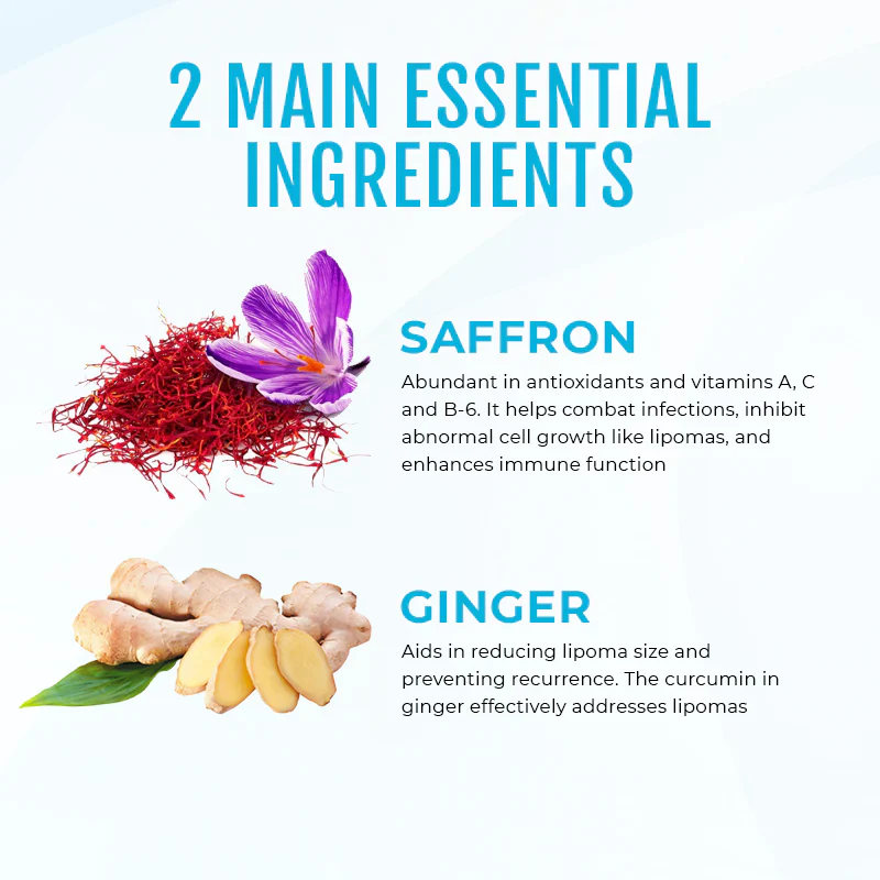 Cvreoz® Lipoma Removal Cream utilizes a unique blend of Ginger and Saffron to effectively address and reduce the size of fatty lumps and benign growths. This soothing cream alleviates discomfort, reduces inflammation, and promotes smoother, lump-free skin.