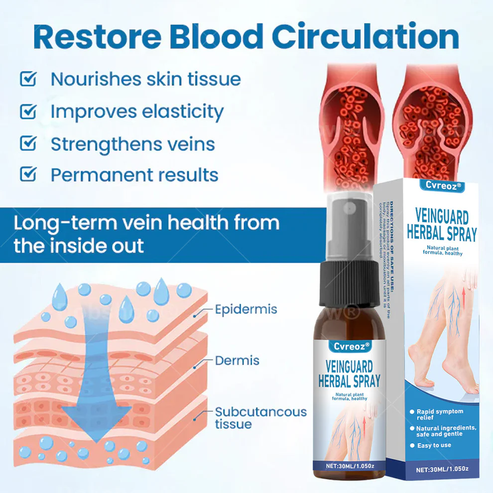 Cvreoz® VeinGuard is the first FDA-certified micro-mist spray with a carefully formulated 99.2% success rate for treating varicose veins at home. Thanks to its innovative Micro-Mist Technology, it penetrates up to 300% deeper into tissue compared to conventional methods, showing visible results within 48–72 hours. Skip costly procedures and care for your veins long-term — easily and comfortably from home.