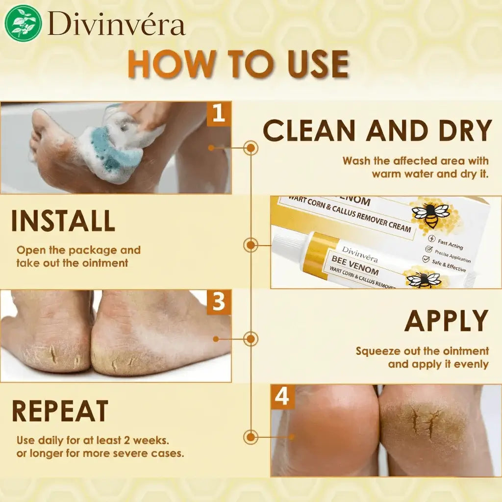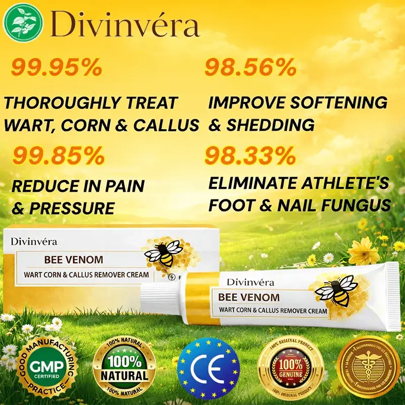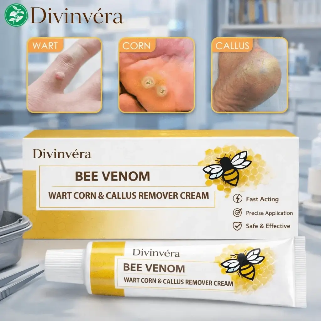 Divinvéra bee venom cream helps reduce the appearance of warts corns and calluses while supporting smoother, healthier skin with daily use