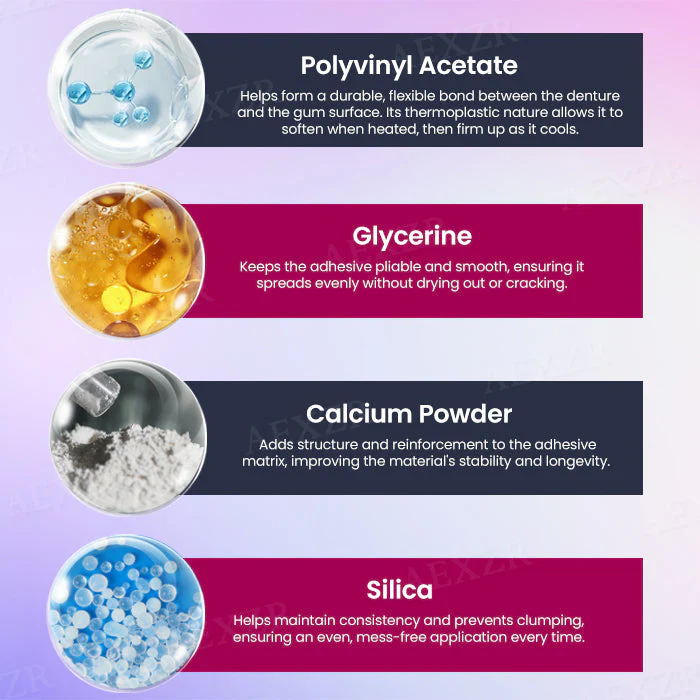 A key binding agent known for its excellent adhesion properties, Polyvinyl Acetate helps form a durable, flexible bond between the denture and the gum surface. Its thermoplastic nature allows it to soften when heated, then firm up as it cools—creating a custom-fit seal that stays in place for days.