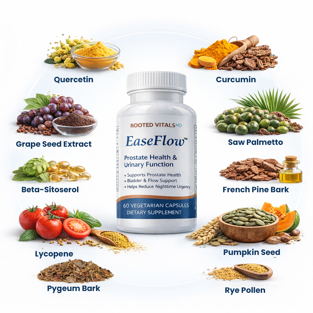 Many conventional approaches focus on managing the symptoms rather than supporting the underlying factors driving them. EaseFlow™ is formulated to work differently — combining a blend of naturally sourced, researched ingredients that support prostate circulation, help maintain healthy tissue, and contribute to a calmer, more balanced urinary experience.