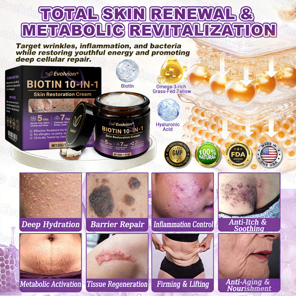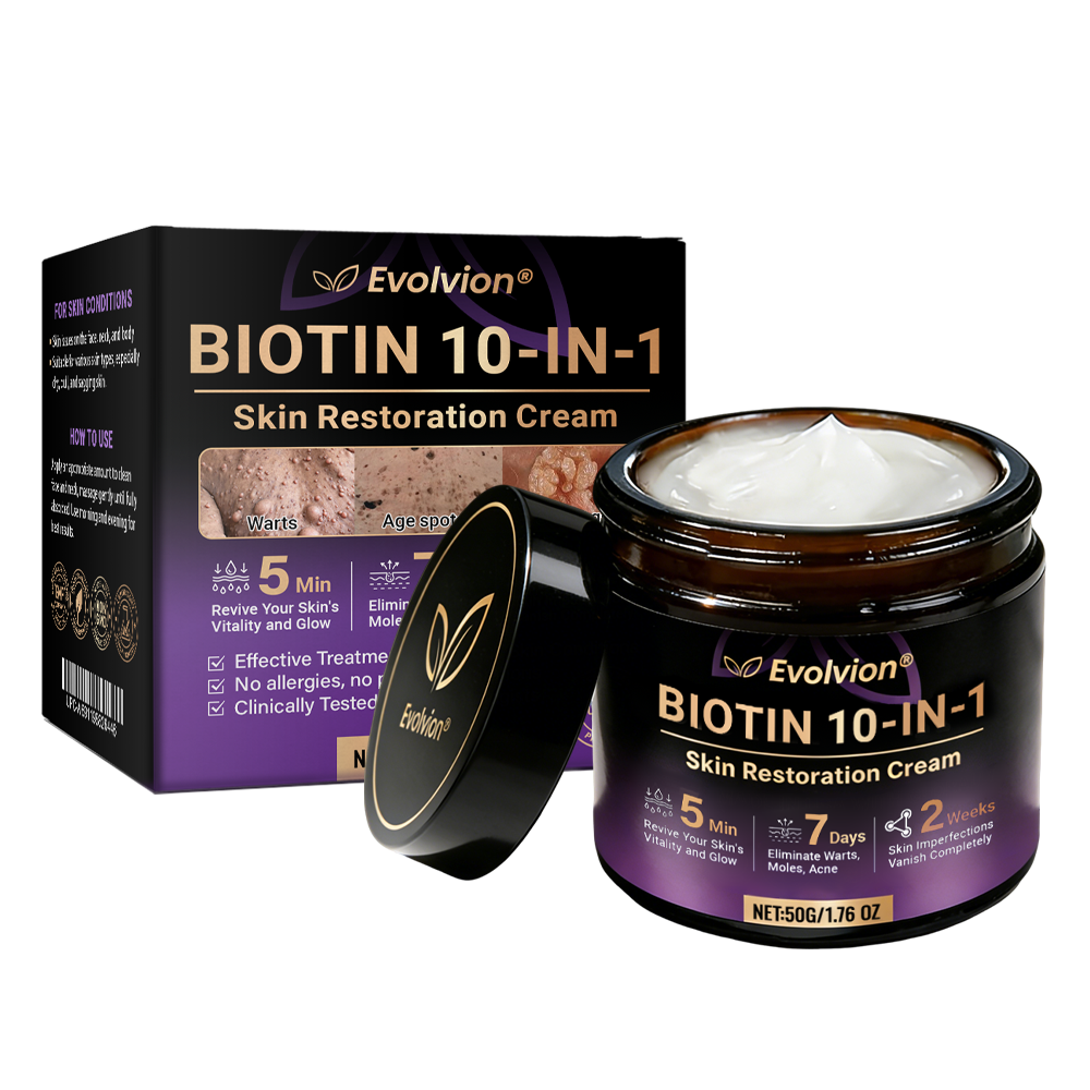 In response, Evolvion® Biotin 10-in-1 Skin Restoration Cream was scientifically developed under rigorous standards. Its formula combines the restorative power of natural biotin and collagen, synergized with hyaluronic acid, vitamin C, centella asiatica, and over ten other potent bioactive ingredients. Together, they deliver multi-dimensional care — from deep hydration and barrier repair to anti-inflammatory relief, itch control, metabolic renewal, tissue restoration, and anti-aging nourishment. Clinically validated and produced in GMP-certified facilities compliant with U.S. and EU safety standards, this cream offers a safe, effective, and multi-repair skincare solution for dryness, inflammation, irritation, and signs of aging — restoring comfort, resilience, and lasting skin health.