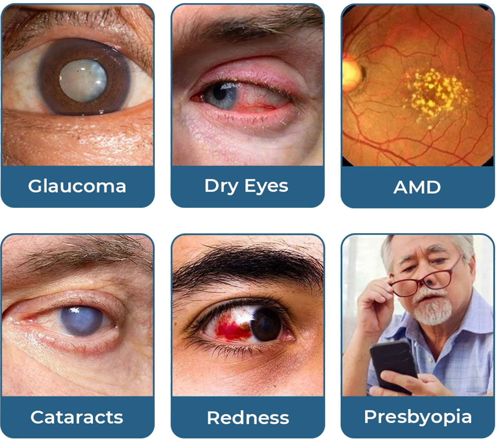 The natural active ingredients penetrate through the bloodstream to the eye, destroying disease-affected cells and returning you to clear vision and eye health. This results in the most effective treatment of all types of eye diseases and their key symptoms: conjunctivitis, glaucoma, cataracts, blepharitis, pterygium, vision loss, irritation, redness, etc.