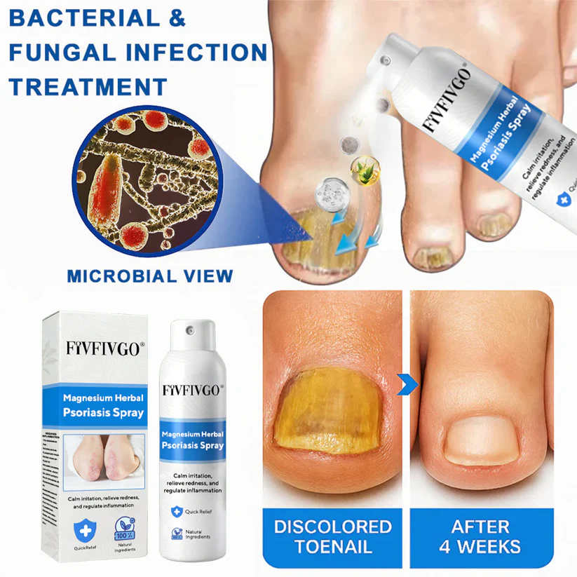 Fivfivgo® Magnesium Herbal Psoriasis Spray is a gentle formula designed for daily use, highly praised for its deep soothing and effective healing properties. It delivers intense hydration to relieve dryness and tightness caused by conditions like psoriasis and eczema. Enriched with natural antioxidants and anti-inflammatory ingredients, it helps regulate inflammation, promotes healthy skin cell renewal, and accelerates the natural repair process of damaged skin. Safe and suitable for all sensitive and problem-prone areas of the body, including intimate regions.