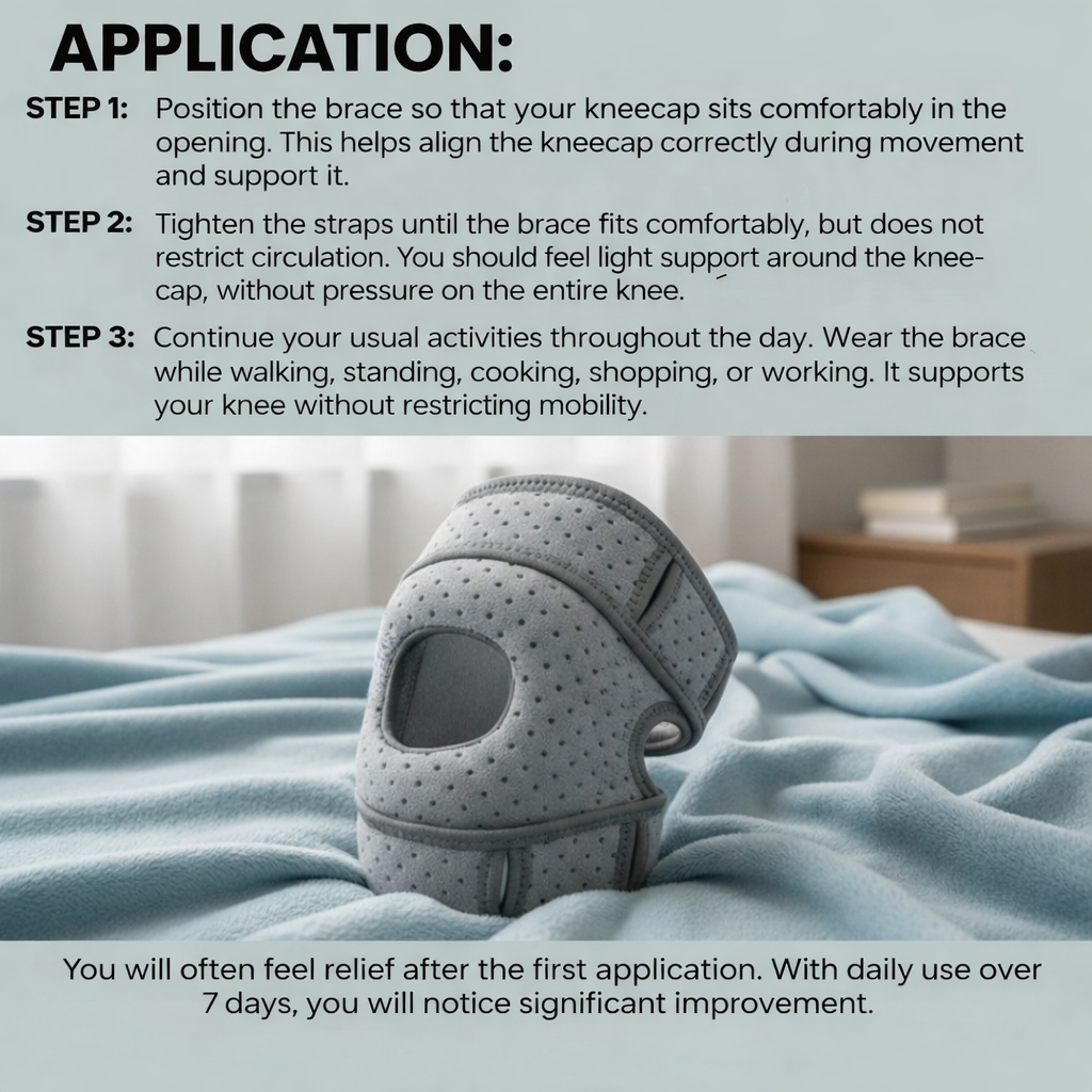 Position the brace so that your kneecap sits comfortably in the opening. This helps to correctly align and support the kneecap during movement.