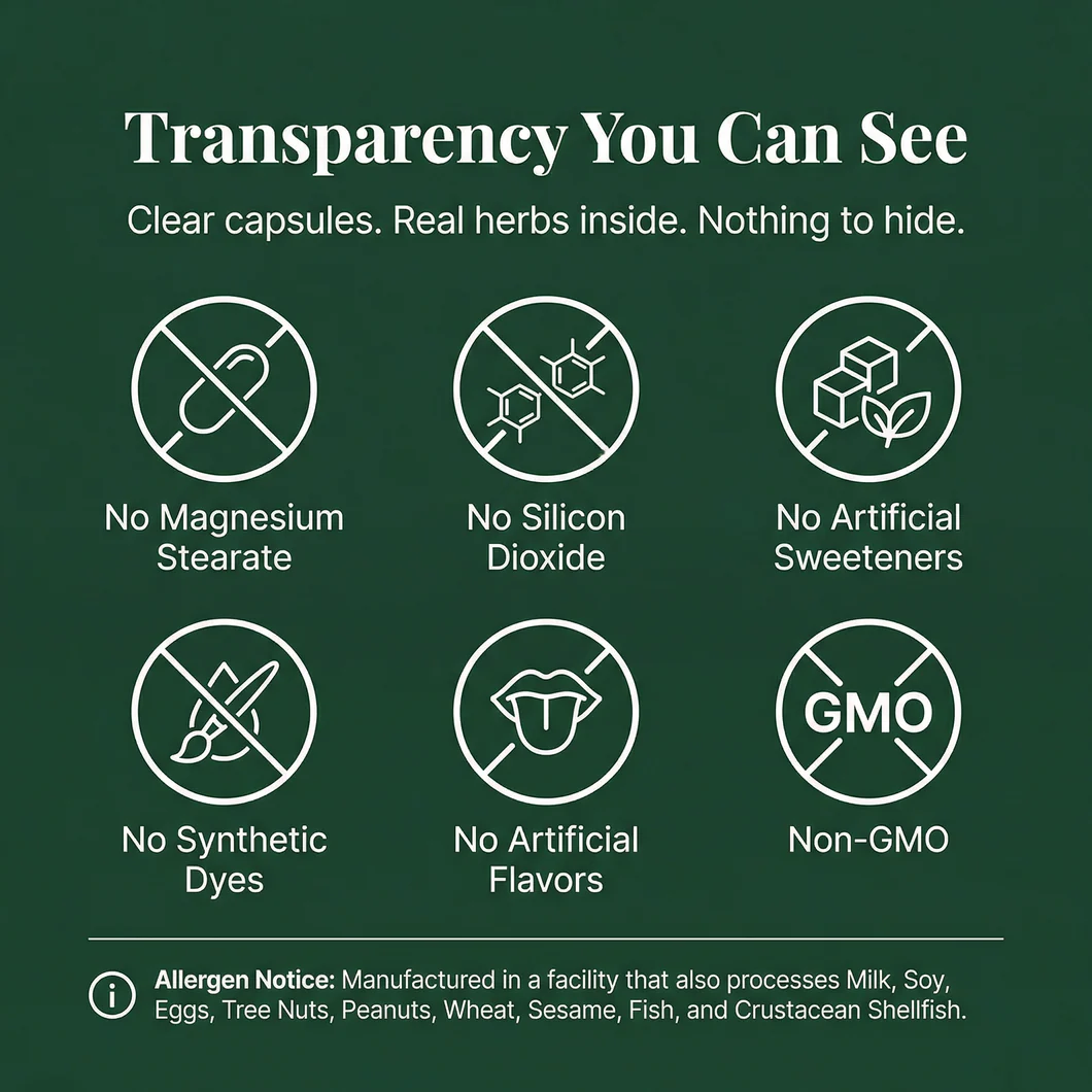 The capsules are clear — you can see the real herbs inside. No fillers, no powder blends hiding behind opaque casings. Two capsules with dinner is all it takes.
