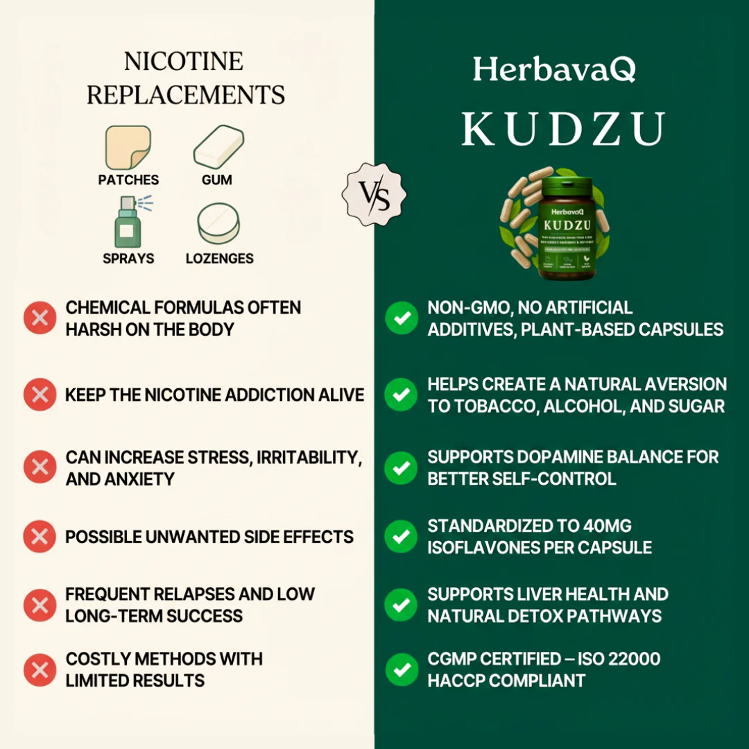 HerbavaQ KUDZU Food Supplement is a natural plant-based formula with 40 mg isoflavones that helps reduce cravings for sugar or habits by supporting dopamine balance