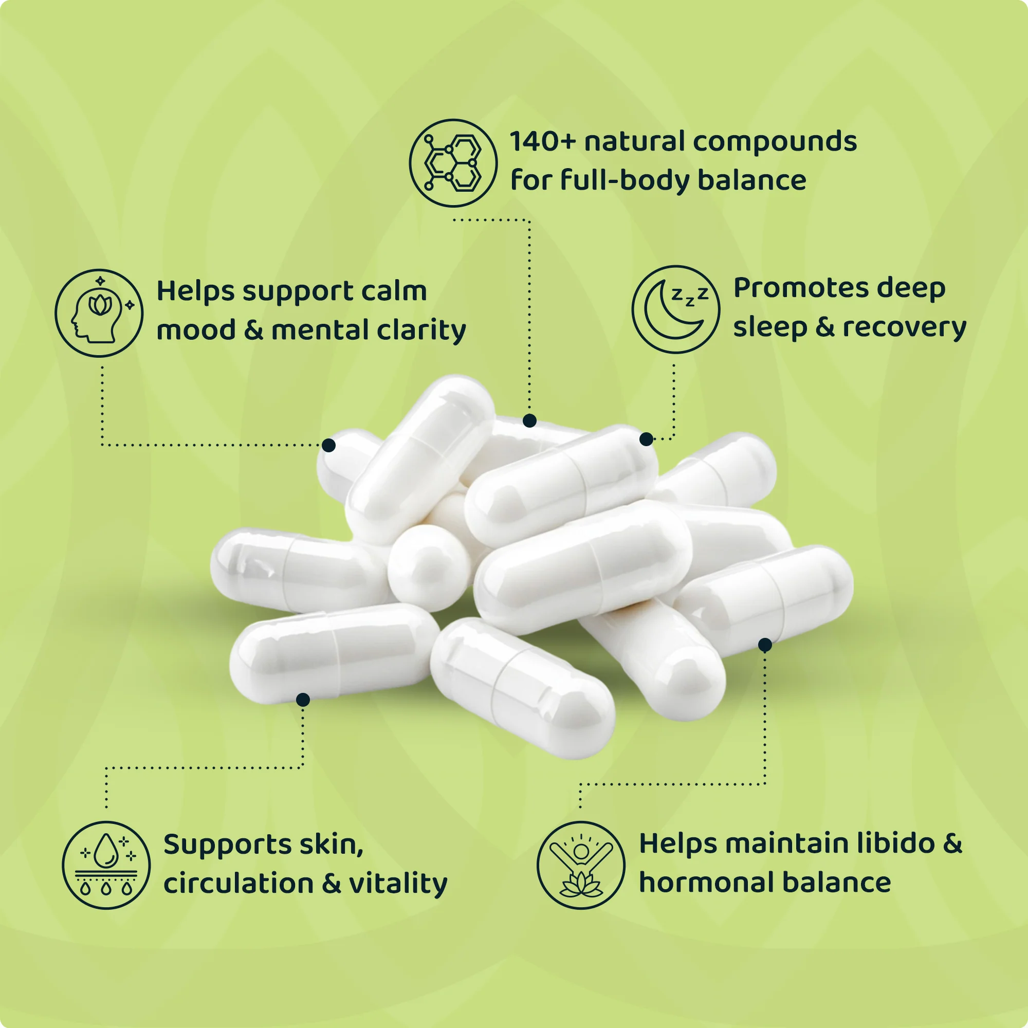 The standardised extract used in this formula contains over 140 naturally occurring phytochemicals, each contributing to a multi-layered approach to stress resilience.