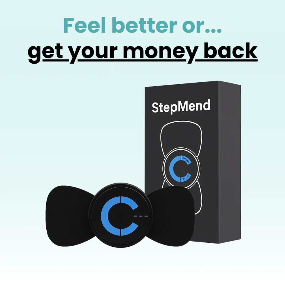 Complete system includes: Stepmend EMS device, 2 medical-grade adhesive pads, USB charging cable, wall adapter, user manual, quick-start guide, recovery eBook (digital), and 90-day habit tracker (digital).