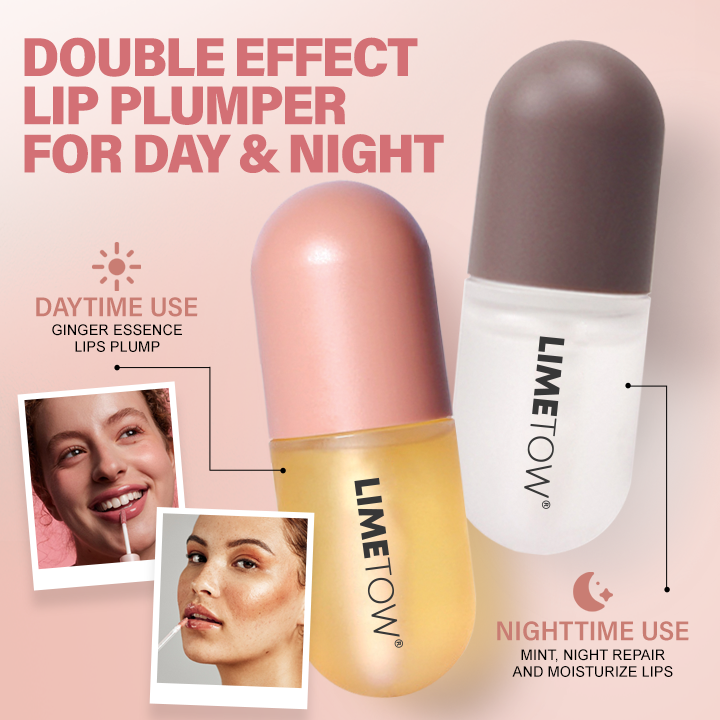 Day and night lip plumper kit with ginger and mint for fuller looking lips, deep hydration, smooth texture, glossy finish, natural volume boost