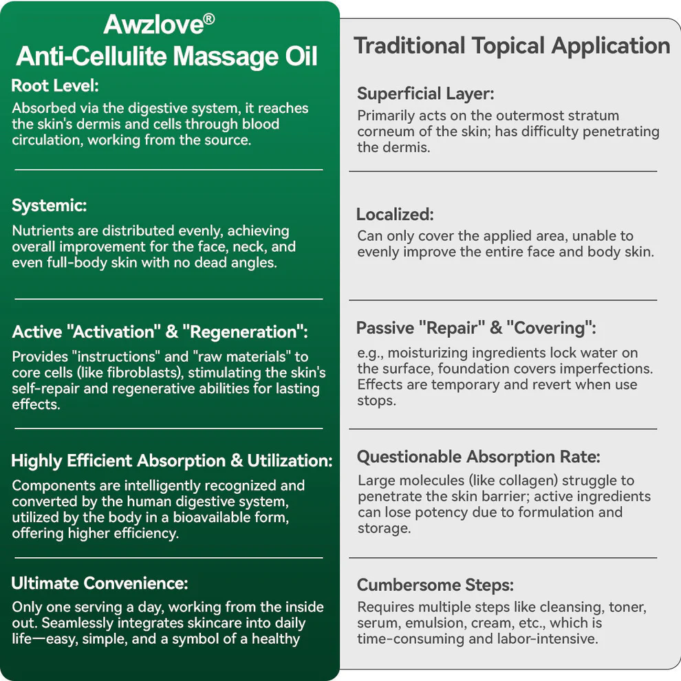 When Awzlove® Luxurious Collagen & Stem Cell Anti-Cellulite Massage Oil is applied to the skin, its bioactive ingredients penetrate through the surface layers and enter the deeper tissues. This begins a full-body topical rejuvenation process. The formula’s Stem Cell Extract, Triple Peptide Complex, and Collagen-activating botanicals deliver highly active molecules directly to the dermis, where they interact with key skin cells—fibroblasts—sending gentle biological signals to “boost regeneration.” This helps stimulate the natural production of collagen and elastin, while enhancing the skin’s internal moisture-retaining structure. At the same time, the antioxidant-rich botanical oils support the skin in defending against daily oxidative stress and environmental damage. This represents a topical bioactive process that improves skin firmness, elasticity, smoothness, and vitality from the outside in—helping restore the look and feel of healthy, youthful skin.