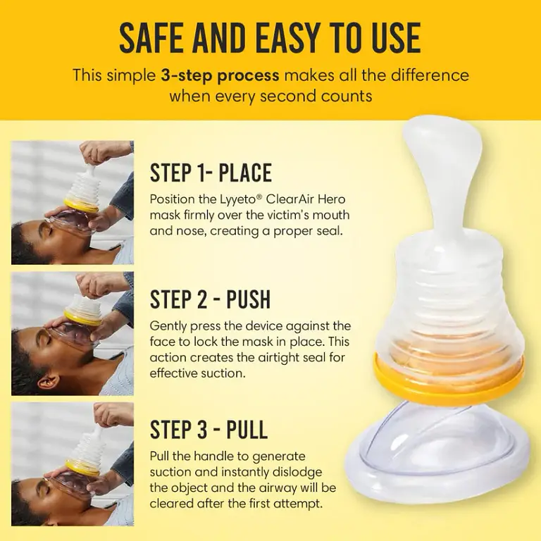 Unlike the Heimlich maneuver, which often requires strength and proper technique, Lyyeto® ClearAir Hero works with a simple suction system that anyone can use — seniors, caregivers, and even the person choking themselves.