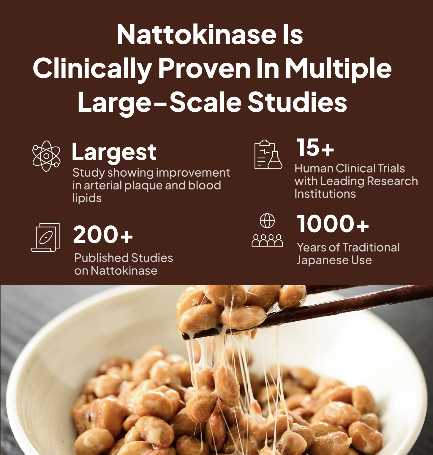 What is nattokinase and how does it support cardiovascular health? Nattokinase is a natural enzyme derived from fermented natto with over 1,000 years of traditional use and 200+ published studies. It supports healthy fibrin levels and arterial flexibility, working alongside your body’s own circulatory processes.