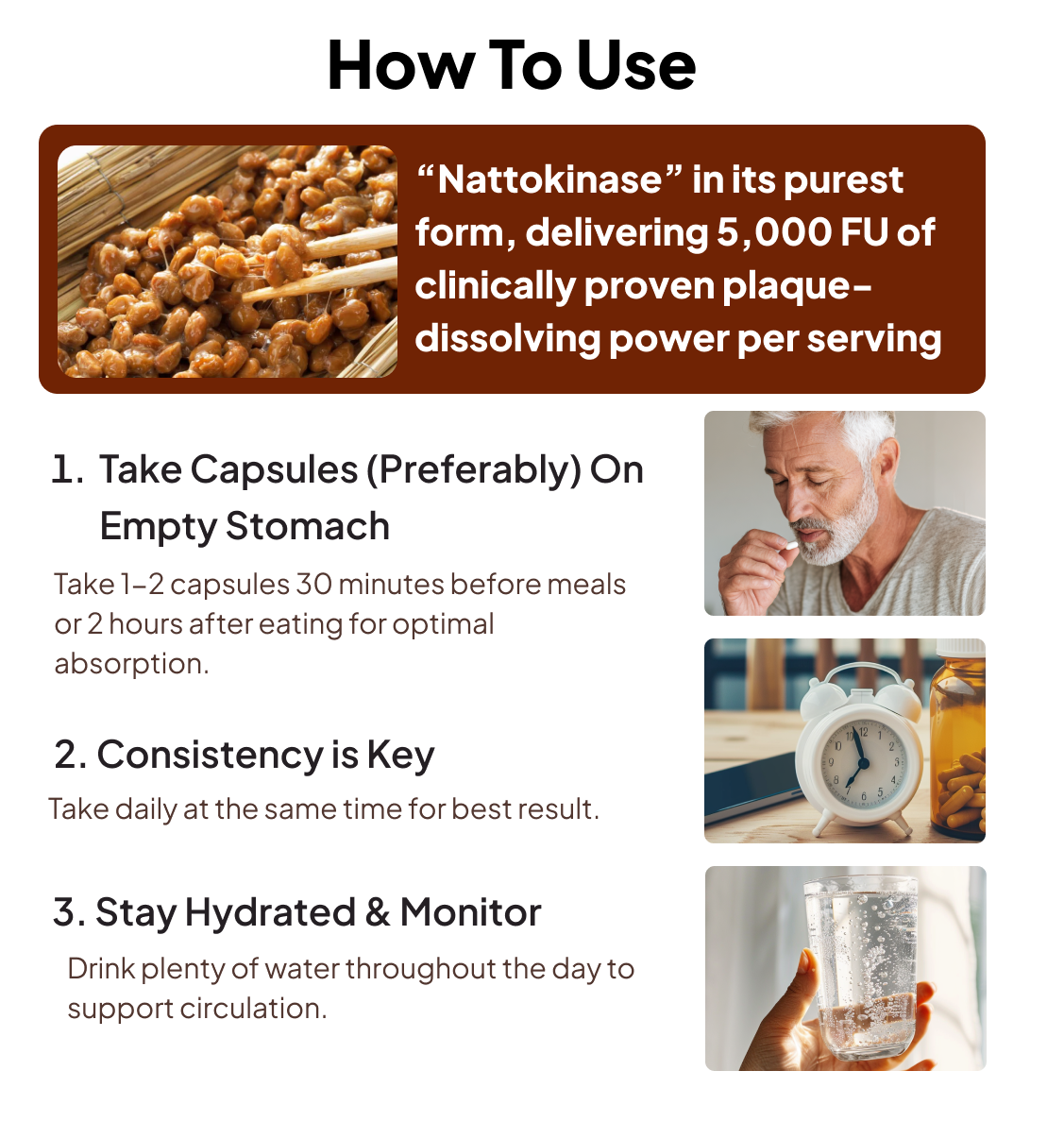 Take one to two capsules daily with water, ideally on an empty stomach or between meals for optimal absorption. Consistency is essential — the long-term cardiovascular benefits of nattokinase build with daily, uninterrupted use. Make it a simple, effortless part of your morning or afternoon routine.
