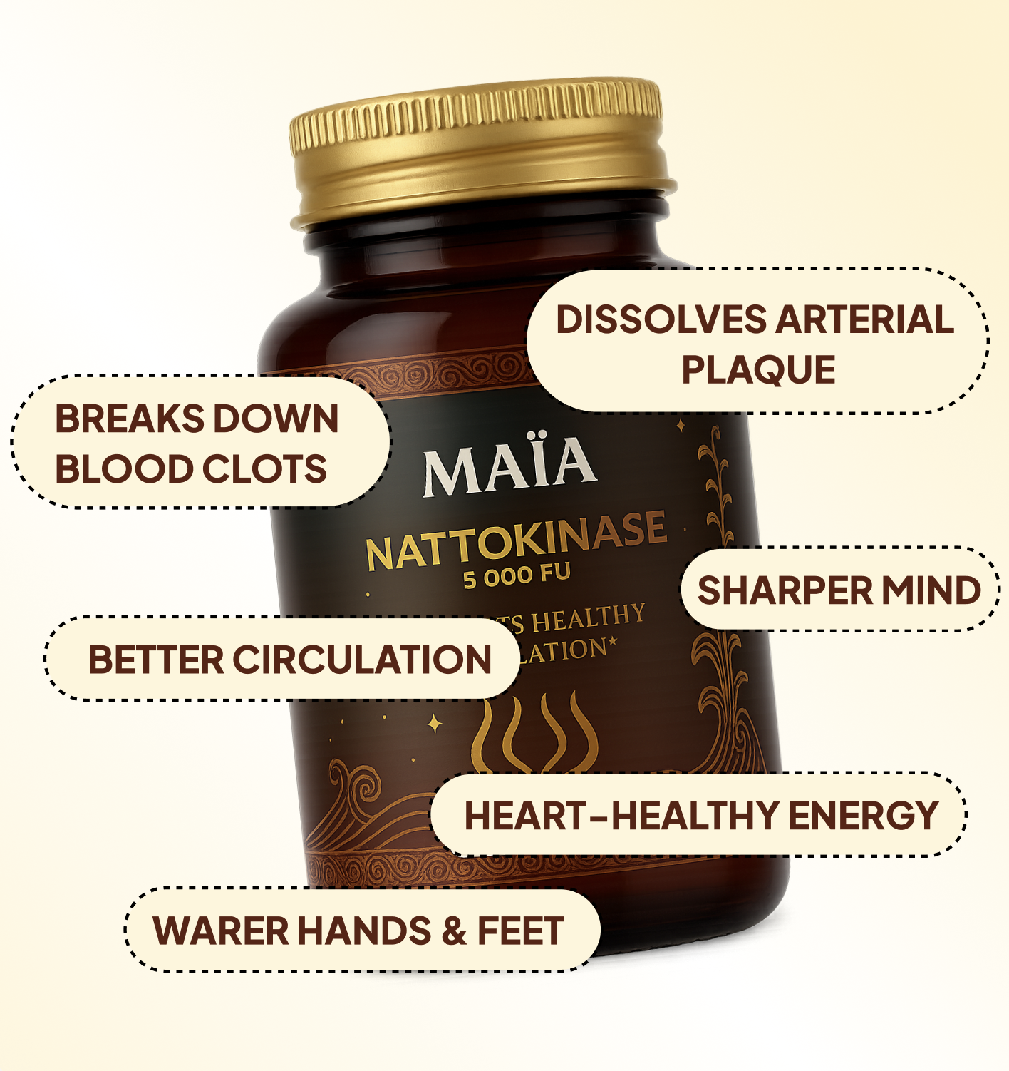 Elevate your cardiovascular wellness with one of nature’s most studied enzymes. If you’re ready to support your arteries, your circulation, and your long-term vitality naturally — Maïa Nattokinase is your essential daily step.