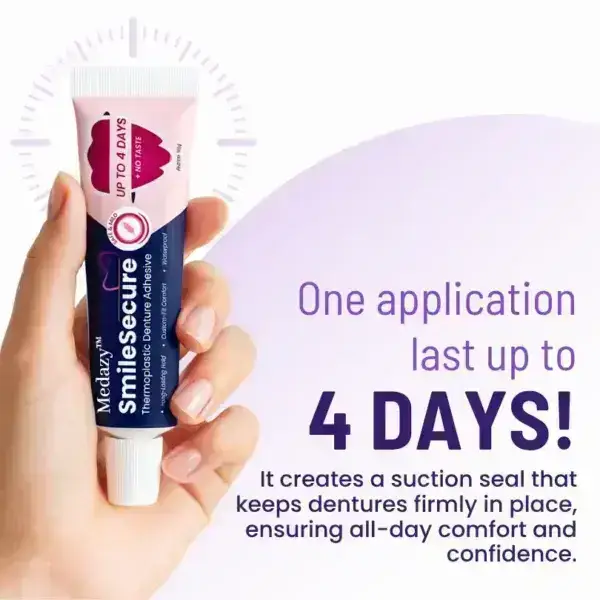 Unlike messy pastes or unreliable powders, Medazy™ SmileSecure is waterproof, food-resistant, and provides a secure hold for up to 4 days—no reapplication needed. Whether you’re eating, speaking, or laughing, your dentures stay firmly in place, giving you lasting confidence all day long.