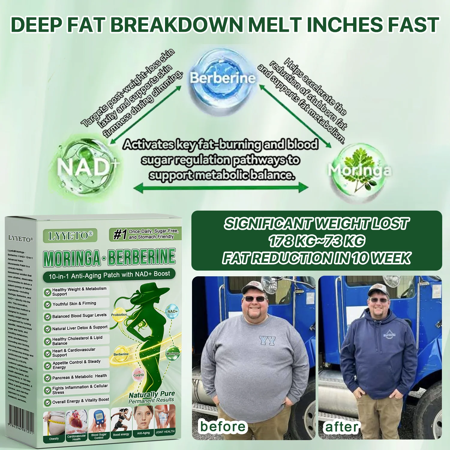 “We are an endocrinology research team from a leading medical institution, many of us having personally experienced obesity and its complications. Over the years, we have evaluated various weight-loss interventions, including injectables, capsules, and oral pills, but their outcomes were often limited with tolerability issues. These experiences led us to develop a safer, more natural, and effective approach to metabolic health and weight management. After 12 years of research, we began self-testing, overcoming the limitations of traditional single-pathway interventions that caused gastrointestinal side effects. By adopting a dual-pathway strategy—regulating appetite and fat metabolism while also addressing skin firmness post-weight-loss—we observed significant improvements in body weight and metabolic health, without rebound weight gain or adverse reactions. Large-scale studies and clinical trials with over 5,000 participants further validated the effectiveness of Lyyeto® Moringa · Berberine + NAD+ 10-in-1 Nano Microneedle Patch in metabolic regulation, appetite control, and overall health, particularly in adults over 40. Backed by contemporary research, it has undergone rigorous FDA evaluation, with its safety, effectiveness, and compliance formally recognized. This formulation advances beyond traditional weight-loss products by offering a natural, safe, and effective option for comprehensive metabolic support and sustainable weight management.”