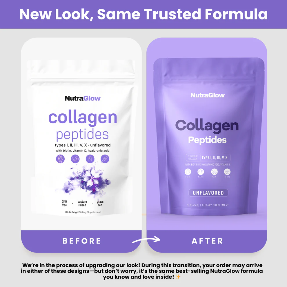 NutraGlow Multi Collagen Anti-Aging Blend restores skin elasticity, reduces wrinkles, and boosts radiance with collagen, hyaluronic acid, and biotin.