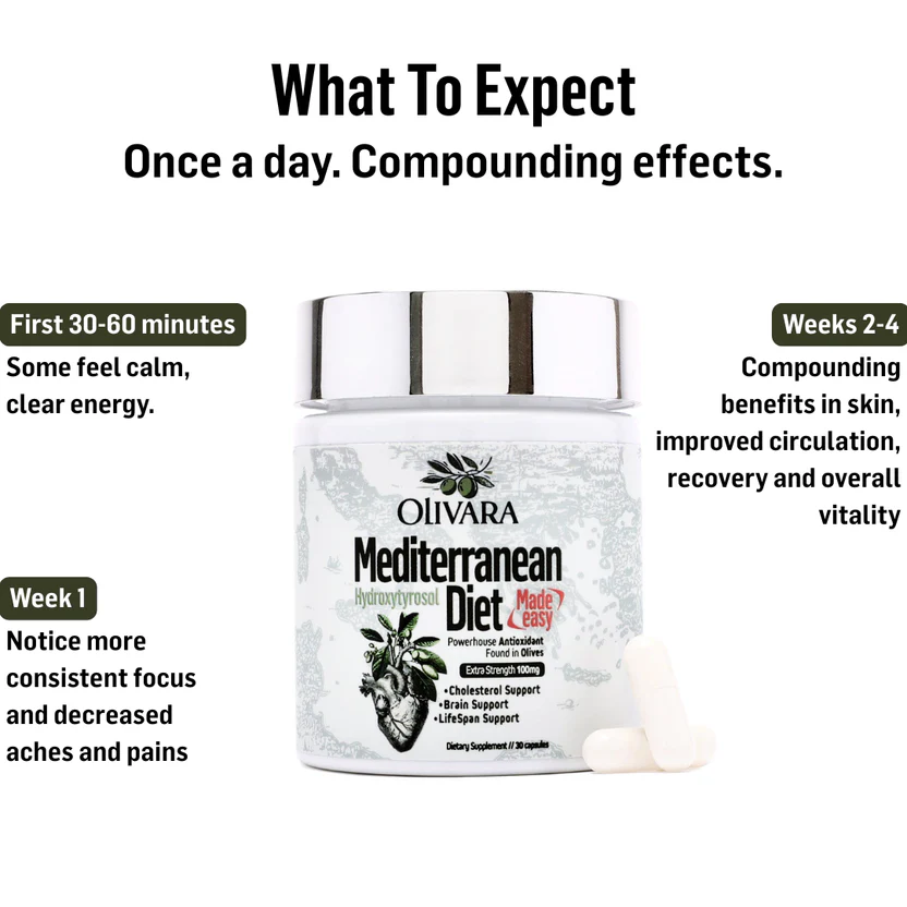 Decades of nutritional research consistently point to the Mediterranean diet as one of the most effective dietary patterns for long-term health. At the core of its benefits is Hydroxytyrosol — a naturally occurring polyphenol found in olives. Olivara isolates this compound and delivers it in a highly bioavailable form, so your body can actually absorb and use it.