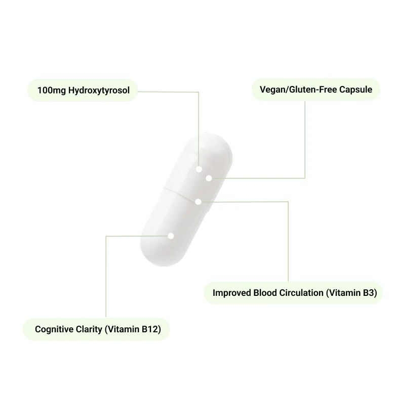 Hydroxytyrosol is the star of this formula — a standardised, high-purity olive polyphenol processed for 98% bioavailability. That means your body absorbs significantly more of what it needs, with far less waste compared to standard antioxidant supplements.