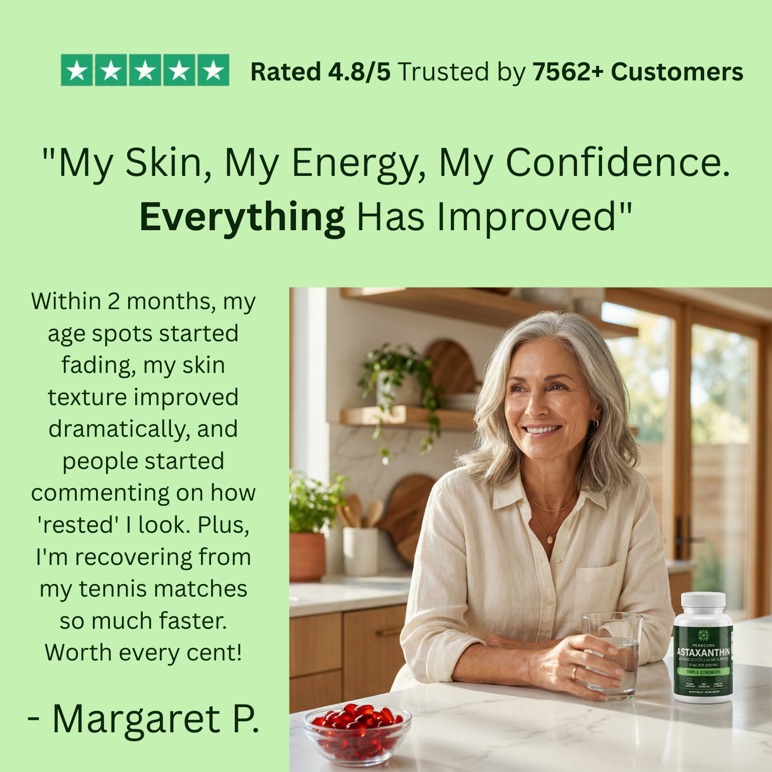 Feel protected from the inside out. With Peakcora Astaxanthin, you’re harnessing the ocean’s most powerful antioxidant to defend your skin, eyes, and body against the oxidative stress of modern life.