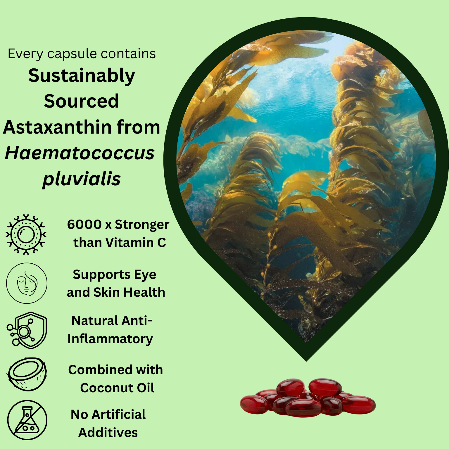 Softgel Capsules: These easy-to-swallow capsules keep the astaxanthin stable, fresh, and evenly dosed.