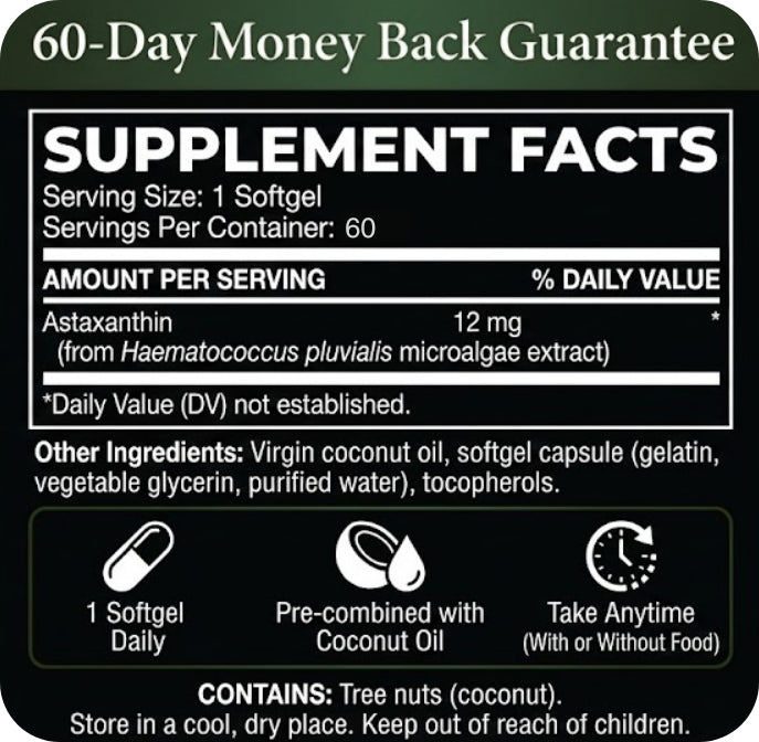 Every capsule is pre-combined with coconut oil, so astaxanthin is already suspended in the fat it needs for absorption. No meal timing. No guessing. Just consistent, powerful protection — every single time you take it.