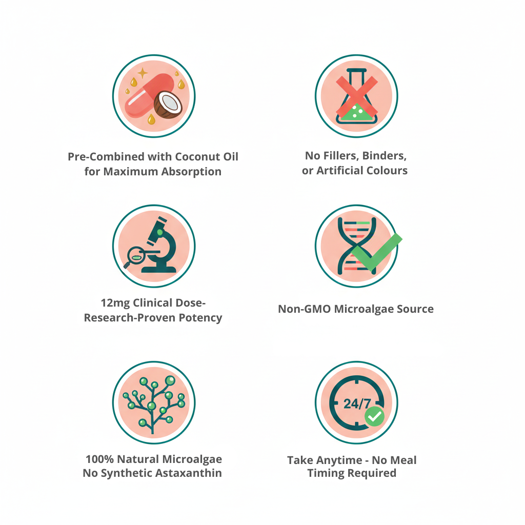 Astaxanthin is fat-soluble — meaning without dietary fat, your body can’t absorb it. Most supplements rely on you taking them with a fatty meal, and if you don’t? You’re flushing money down the drain.