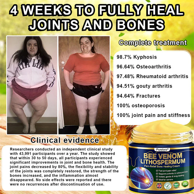 “For years, I struggled with constant knee pain and swelling—my friends used to joke that my knees looked like footballs. When I came across Purelora® BEE VENOM LITHOSPERMUM Pain-Relief Bone Healing Cream, I thought I’d give it a go, and it turned out to be the best decision! In less than three weeks, I noticed an incredible improvement—my knee pain eased significantly, and the swelling completely disappeared. Now, I feel like I’ve fully recovered, and this cream has truly made a difference in my life. I’m so grateful for it!”– Isabella Walker