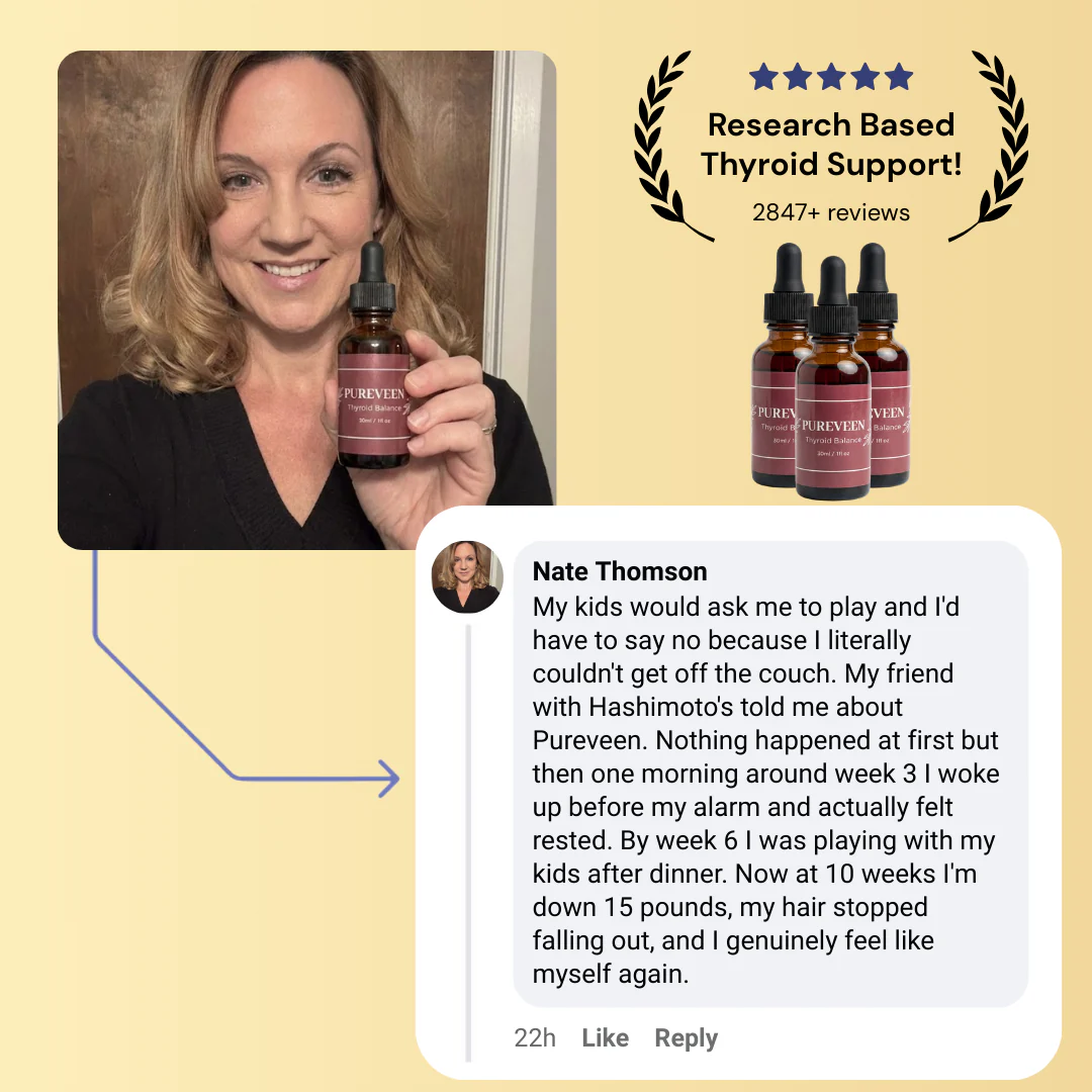 💬 “I’d given up on losing weight. Accepted it was just my thyroid. After two months on Pureveen, I’ve lost 31 pounds. The same diet that wasn’t working before is working now.” — Kristin A.