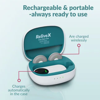 - Thanks to its wireless design, compact size, and rechargeable premium charging case, you can use ReliveX anywhere your day takes you: comfortably at home, while traveling, or even at the office. Its discreet and quiet operation means you can get your daily decompression and core activation without drawing attention, making it perfect for those who might have limited mobility but still need consistent relief.