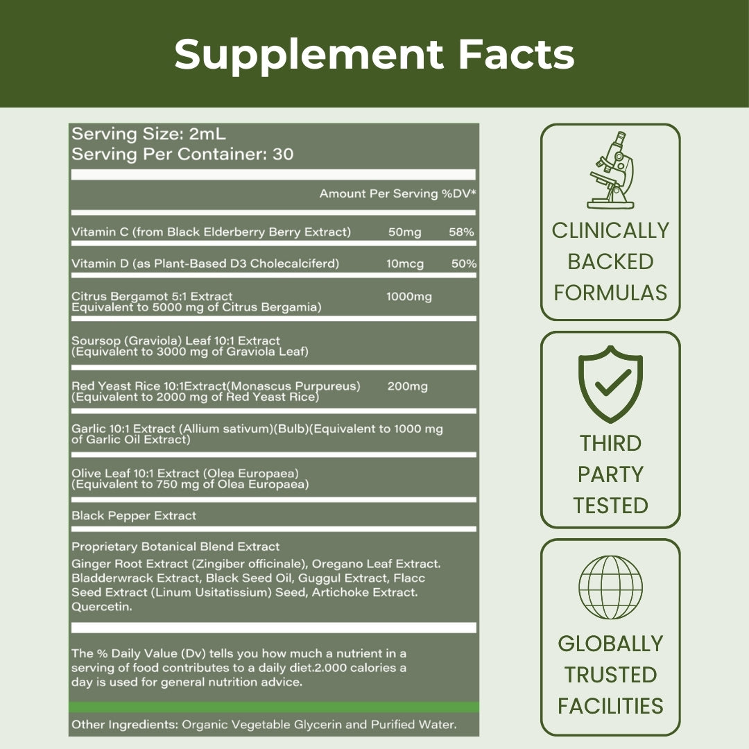 2 mL under your tongue daily. Better cholesterol. Better energy. Better outcomes—without the pill hangover.