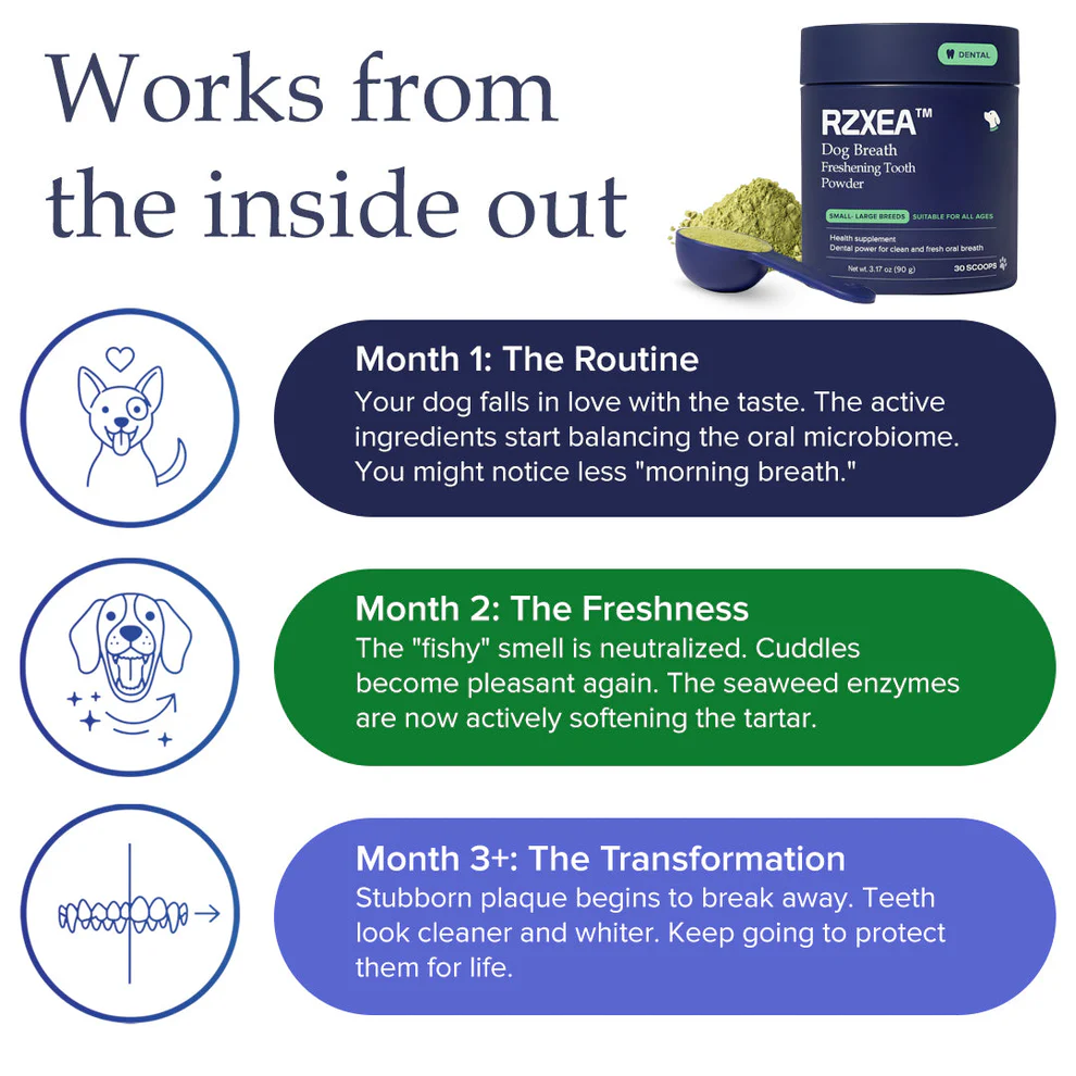 You love your dog, but you hate their breath. And let’s be honest—you aren’t going to brush their teeth every day. RZXEA™ fixes the problem where it starts, zero stress involved.