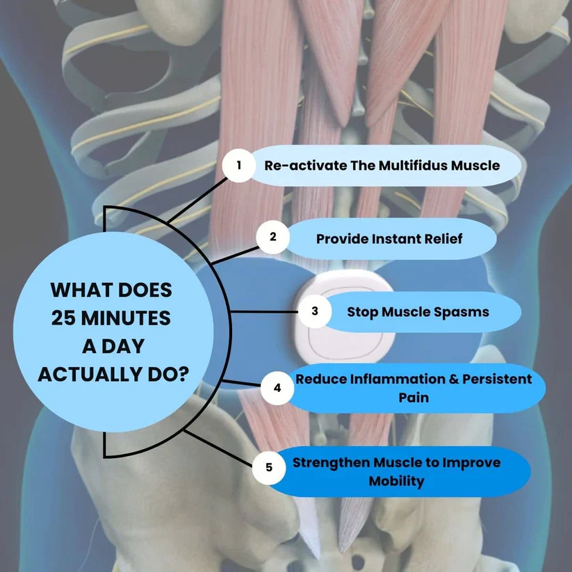 Relieving back pain using targeted neuromuscular stimulation works by reactivating the multifidus muscle — a deep stabilizing muscle that plays a critical role in supporting and protecting the spine. When the multifidus becomes weak or inactive due to poor posture, prolonged sitting, or injury, the spine loses stability, circulation is reduced, and surrounding muscles overcompensate, leading to tension, inflammation, and nerve irritation often felt as lower back pain or sciatica. Targeted neuromuscular stimulation gently activates this muscle again, helping restore proper engagement, improve blood flow, and support natural spinal stability. As the multifidus regains function, the spine is better supported, movement feels more controlled, and everyday discomfort gradually decreases.