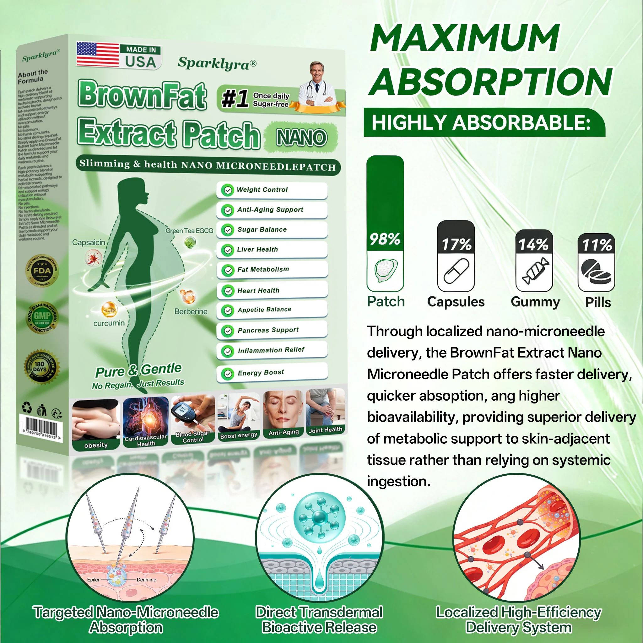 Through localized nano-microneedle delivery, the BrownFat Extract Nano Microneedle Patch supports glucose regulation and metabolic efficiency by targeting skin-adjacent metabolic tissue rather than relying on systemic ingestion. Bioactive compounds such as cinnamon polyphenols, berberine, and green tea EGCG modulate glucose uptake and utilization at the tissue level, helping attenuate post-meal glucose fluctuations and improve metabolic flexibility. By supporting insulin sensitivity and promoting more efficient hepatic glucose handling, the patch contributes to steadier energy release and reduced glycemic volatility throughout the day. In parallel, activation of brown adipose–associated pathways enhances mitochondrial fuel utilization, shifting excess glucose and fatty acids toward energy dissipation rather than storage. With consistent use, this localized, multi-pathway approach supports improved glucose stability, enhanced insulin responsiveness, more efficient energy metabolism, and smoother, more controlled glycemic patterns—without sharp spikes or crashes.